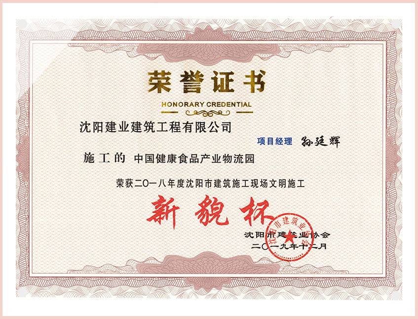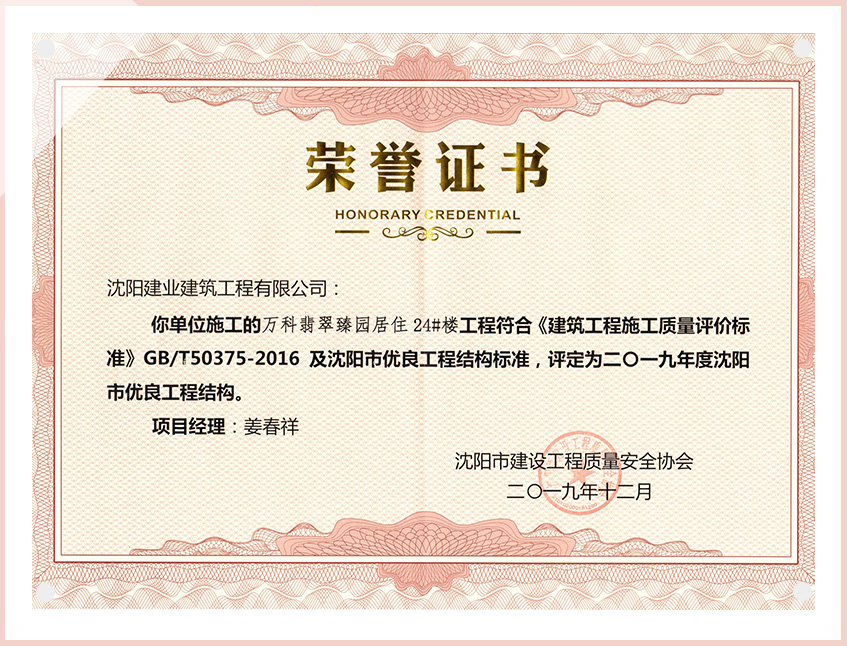 工程質(zhì)量多次進(jìn)入遼寧省前十名,其中多個項目獲得“遼寧省優(yōu)質(zhì)結(jié)構(gòu)”、“沈陽市優(yōu)質(zhì)結(jié)構(gòu)”、“沈陽市優(yōu)良工程”、“新貌杯”、“玫瑰杯”、“沈長哈三市優(yōu)質(zhì)金杯獎”、“沈陽市民營企業(yè)規(guī)模百強”、“沈陽市模范勞動關(guān)系和諧企業(yè)”、“沈陽市先進(jìn)施工單位”等多項獎項。